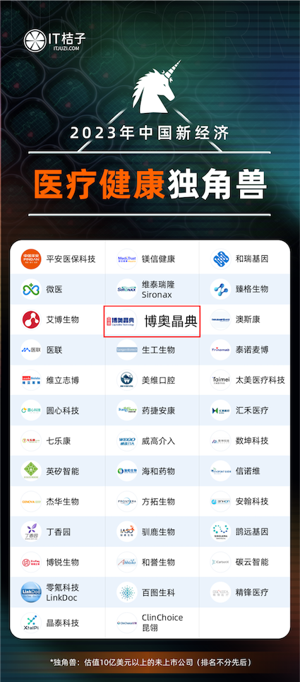 1月18日,新經(jīng)濟創(chuàng)投數(shù)據(jù)服務商 IT 桔子正式發(fā)布《2023年中國新經(jīng)濟獨角獸企業(yè)》系列重磅榜單。博奧晶典憑借在醫(yī)療健康領域的持續(xù)深耕及領先行業(yè)的卓越創(chuàng)新能力,榮登2023年中國新經(jīng)濟榜單,再獲行業(yè)權威認可。