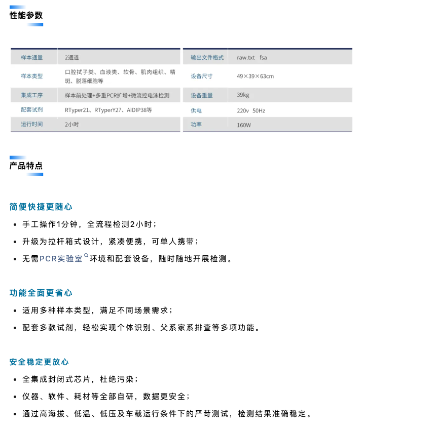 該設(shè)備采用拉桿箱式設(shè)計,可由單人攜帶使用,適用于戶外、車載、高原環(huán)境等,是國際首款“可移動法醫(yī)DNA實驗室”,為全球公共安全部門在現(xiàn)場物證檢驗,重點人員篩查、重大公共安全事件的快速處置、出入境邊防檢查等應(yīng)用場景增添強勁利器。