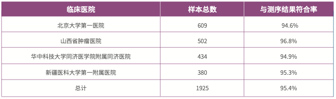1925 例來自北京大學(xué)第一醫(yī)院、山西省腫瘤醫(yī)院等醫(yī)療機(jī)構(gòu)的臨床樣本使用 HPV 檢測試劑盒檢測結(jié)果表明:對于 HPV 感染陽性的樣本,芯片檢測結(jié)果與 DNA 測序結(jié)果比較,符合率在 95% 以上。