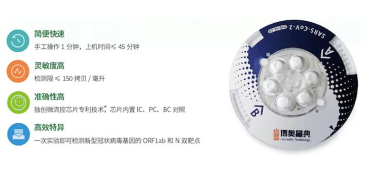 本產(chǎn)品采用博奧自主研發(fā)的微流控集成式核酸提取純化和高靈敏度擴(kuò)增檢測技術(shù),由國家科技部“新型冠狀病毒感染的肺炎疫情應(yīng)急項(xiàng)目”支持,能快速精準(zhǔn)地完成對(duì)新型冠狀病毒的“樣本進(jìn)—結(jié)果出”式全自動(dòng)、全密閉檢測。特殊工藝制作的微流控芯片上集成了樣本裂解、核酸提取、巢式擴(kuò)增和熒光檢測等功能,通過芯片巢式恒溫?cái)U(kuò)增技術(shù),實(shí)現(xiàn)對(duì)痕量病毒核酸高敏擴(kuò)增和檢測,每張芯片可檢測兩個(gè)樣本,能在45分鐘內(nèi)一步完成全程實(shí)驗(yàn),達(dá)到對(duì)新型冠狀病毒核酸的快速檢測。(國械注準(zhǔn):20213400101)