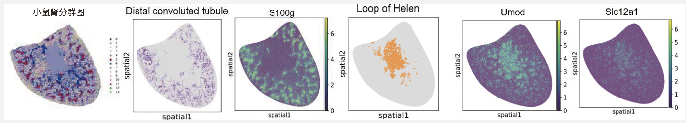使用博奧晶典高分辨率空間轉錄組平臺, 構建了小鼠腎的高分辨率空間轉錄組圖譜,揭示了腎組織空間分區(qū)結構(圖3)。其次,小鼠腎基因表達圖譜與HE 染色結果相結合可以清晰的了解各細胞類群的基因表達及相互作用,揭示它們對疾病發(fā)生、發(fā)展、治療、預后評估的價值。