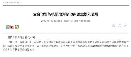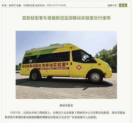 10月19日,“珠海市核酸檢測基地”在廣東省珠海市人民醫(yī)院正式揭牌啟用。揭牌儀式上,由清華大學、生物芯片北京國家工程研究中心和北京博奧晶典生物技術(shù)有限公司共同自主研發(fā)的首款輕型客車搭載的全集成新冠檢測移動實驗室正式亮相。