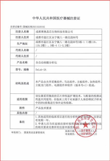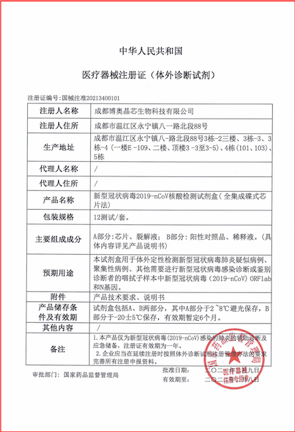 2021年2月10日,恰逢新春佳節(jié)來臨之際,依托國家科技部應急攻關項目,博奧聯(lián)合清華大學成功研發(fā)的由新型冠狀病毒2019-nCoV核酸檢測試劑盒(全集成碟式芯片法)(國械注準:20213400101)和全自動核酸分析儀(國械注準:20213220102)組成的全集成芯片實驗室獲國家藥監(jiān)局應急審批批準,為全國新冠肺炎疫情防控提供現(xiàn)場快速檢測“芯”利器。