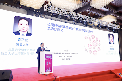 復(fù)旦大學(xué)黨委副書記、復(fù)旦大學(xué)上海醫(yī)學(xué)院黨委書記袁正宏教授作了題為《乙型肝炎病毒感染分子機(jī)制的可視化研究及診療意義》的專題報告。報告介紹了研究團(tuán)隊利用基于 bDNA 的熒光原位雜交結(jié)合免疫熒光技術(shù)及 CRISPR-Tag 活細(xì)胞實時熒光失蹤技術(shù),系統(tǒng)性地建立了在體外細(xì)胞和組織系統(tǒng)進(jìn)行原位雜交加熒光、顯色檢測HBV核酸和蛋白可視化的方法。通過可視化技術(shù),研究團(tuán)隊在亞細(xì)胞水平直接觀察到HBV病毒組分,揭示了HBV病毒部分關(guān)鍵復(fù)制環(huán)節(jié)的細(xì)節(jié),填補(bǔ)了HBV生活史一些關(guān)鍵環(huán)節(jié)的時空信息。在組織水平觀察到病毒核酸與蛋白的分布特征,反應(yīng)肝臟內(nèi)HBV病毒的生活特征。課題組開發(fā)的可視化技術(shù)可以用來監(jiān)測慢乙肝患者抗病毒治療后病毒蛋白質(zhì)和核酸,尤其 cccDNA 的清除情況,有助于臨床醫(yī)生制訂更好的治療方案,并可為指導(dǎo)開發(fā)新藥物提供幫助。