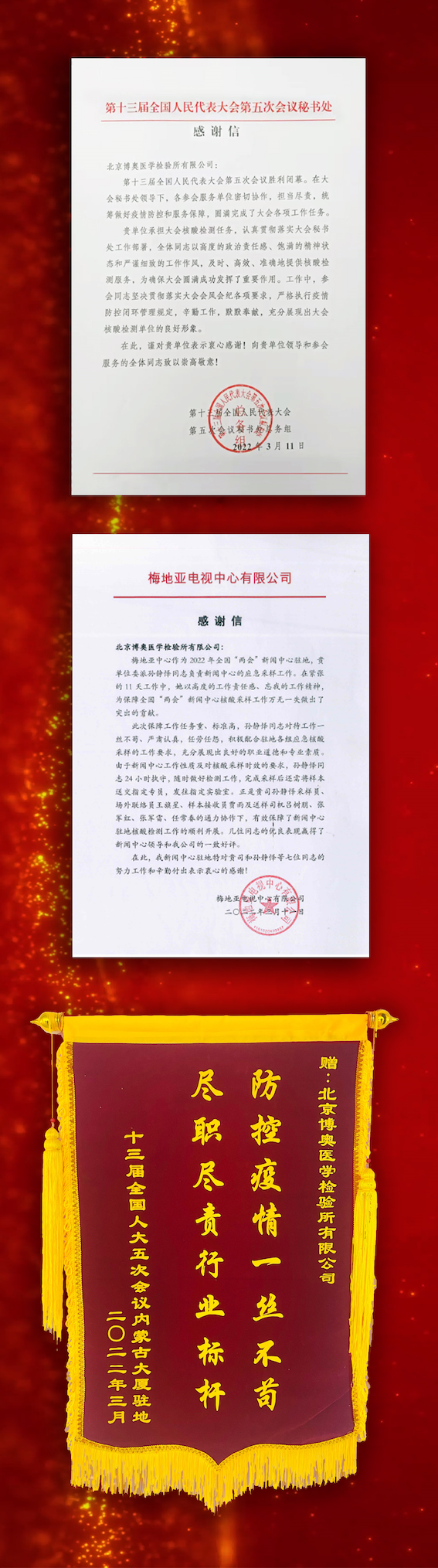 為此,博奧晶典旗下北京博奧醫(yī)學檢驗所收到了來自全國人大第五次會議秘書處、全國兩會新聞中心駐地梅地亞電視中心的感謝信及全國人大五次會議內(nèi)蒙古大廈駐地的致敬錦旗。