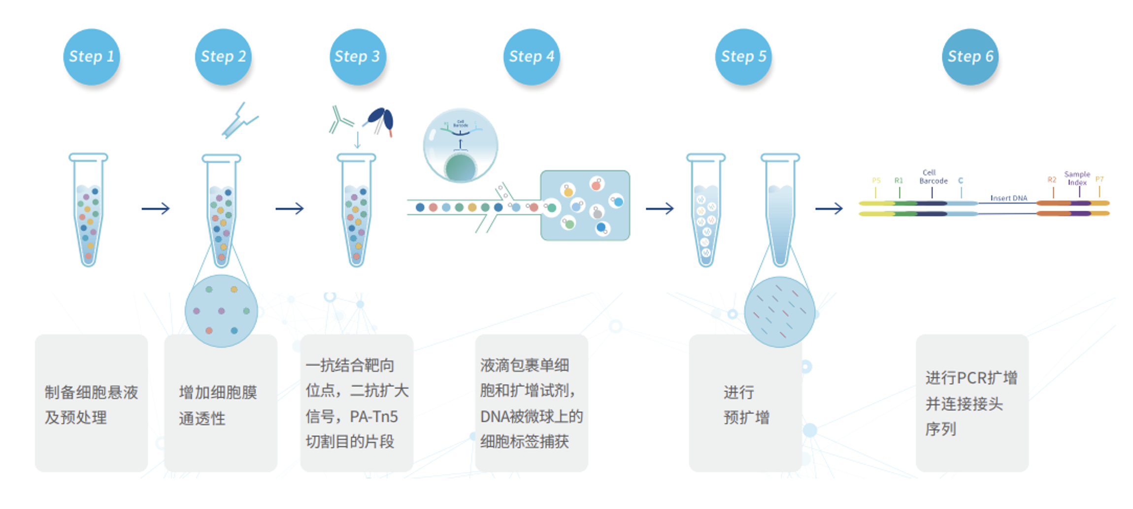 本試劑盒通過抗體和 Tn5 酶識(shí)別蛋白與 DNA 的結(jié)合位點(diǎn),并靶向切割 DNA 分子?;谝旱挝⒘骺丶夹g(shù)將經(jīng)過處理的單個(gè)細(xì)胞包裹形成油包水結(jié)構(gòu),并借助帶有細(xì)胞標(biāo)簽的微球捕獲 DNà 片段和標(biāo)記 DNA 分子,實(shí)現(xiàn)蛋白與 DNA 位點(diǎn)結(jié)合的測(cè)序,具有高通量、超高分辨率、超強(qiáng)特異性的特點(diǎn)。目前提供的檢測(cè)抗體:可選5種組蛋白修飾:H3K27ac、H3K4me1、H3K4me3、H3K27me3、H3K36me3;1種DNA結(jié)合蛋白:Rpb1(RNA聚合酶 Ⅱ)